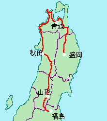 8/25 大宮++(電車)++福島−山形103km 8/26 山形−新庄−真室川 94km 8/27 真室川−横手−大曲 96km 8/28 大曲−秋田−能代 126km 8/29 能代−深浦−車力 144km 8/30 車力−竜飛岬−青森 130km 8/31 青森−三沢−八戸 133km 9/1 八戸−二戸−盛岡 129km 9/2 盛岡++(電車)++大宮 | ![]() |